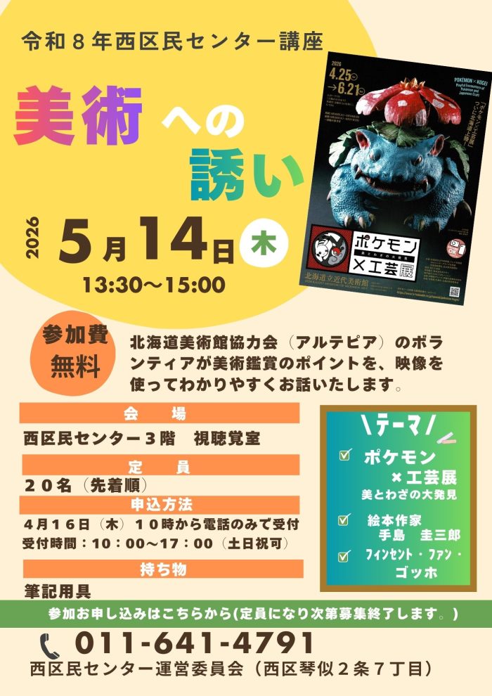 • お知らせ 2026年03月19日(木曜日)西区民講座「美術への誘い」講座開講のおしらせ